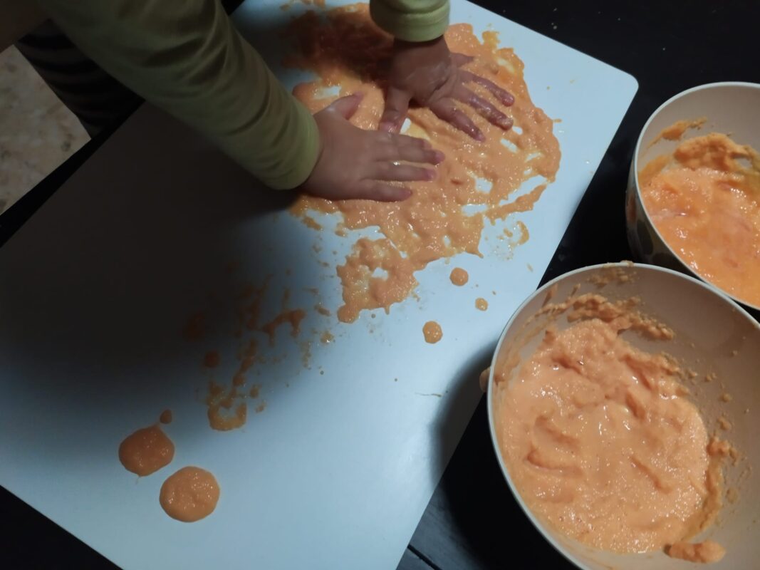Adesso potete tagliare la zucca a pezzi e metterla a cuocere con un po’ d’acqua. Quando la forchetta si infilerà facilmente al suo interno potrete scolarla e frullarla. Ne verrà fuori una profumatissima crema con cui poter dipingere. L’esperienza sensoriale può essere proposta a qualsiasi età. I bambini più piccoli (dai 6 mesi) immergeranno le loro mani e apprezzeranno la cremosità della zucca, coloreranno braccia e viso, potrebbero assaggiarla e apprezzare, oppure no, il suo profumo deciso. I più grandi, oltre ad aiutarvi nella preparazione, potrebbero lasciare sul foglio le proprie tracce e creare un dipinto che vi ricordi il tempo passato assieme.