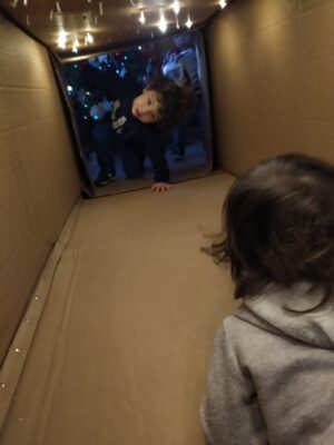 Il cartone sposa perfettamente questa esigenza e così può trasformarsi in una macchina pronta a partire per andare a fare la spesa. Un cartone grande e vivibile può diventare una capanna da colorare e decorare assieme e in cui leggere delle storie o un fortino, un luogo privato in cui sentirsi protetti, giocare e muovere i primi passi verso l’autonomia.