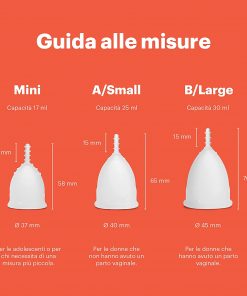 Taglia A: diametro 40 mm, altezza totale 65 mm, capacità 25 ml. Per le donne che NON hanno avuto parti naturali.