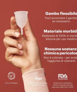 Una volta indossata, la puoi utilizzare per 12 ore di fila per sentirti libera e con la garanzia di non avere perdite: infatti OrganiCup ha una capacità assorbente pari a 3 tamponi interni tradizionali. Non avrai problemi durante il giorno e durante la notte. Realizzata in morbido silicone medicale, senza lattine e senza BPA, è certificata ipoallergenica e atossica, rispetta il tuo corpo, scongiurando il pericolo di infezioni e secchezza, e rispetta l’ambiente con la sua “vita utile” di anni e non certo di ore. Nessun inquinamento, nessuna spesa mensile, la tua unica preoccupazione sarà di sostituire la coppetta ogni 10 anni.