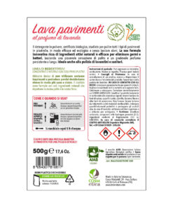 - Lavapavimenti senza risciacquo: un detergente in polvere, certificato biologico, studiato per pulire tutti i tipi di pavimenti in piastrelle, in modo efficace ed ecologico e senza lasciare aloni. La sua formula innovativa ricca di ingredienti attivi naturali è efficace per eliminare germi e batteri, lasciando una piacevole sensazione di pulito e un gradevole profumo di lavanda persistente a lungo. Ideale anche per la pulizia di lavandini e sanitari.