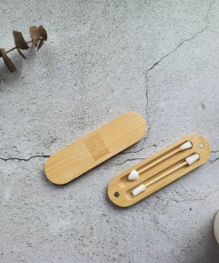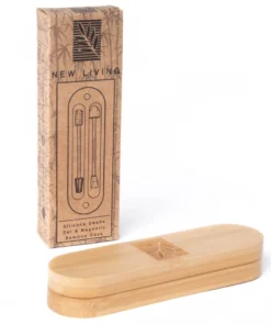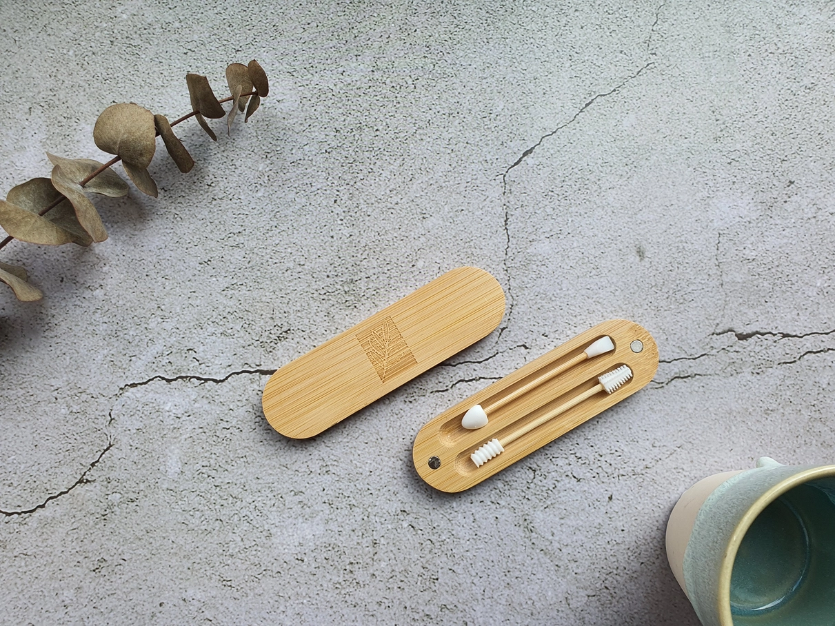La confezione magnetica è interamente in bambù e include due tamponi in silicone riutilizzabili con testine differenti per soddisfare ogni esigenza.