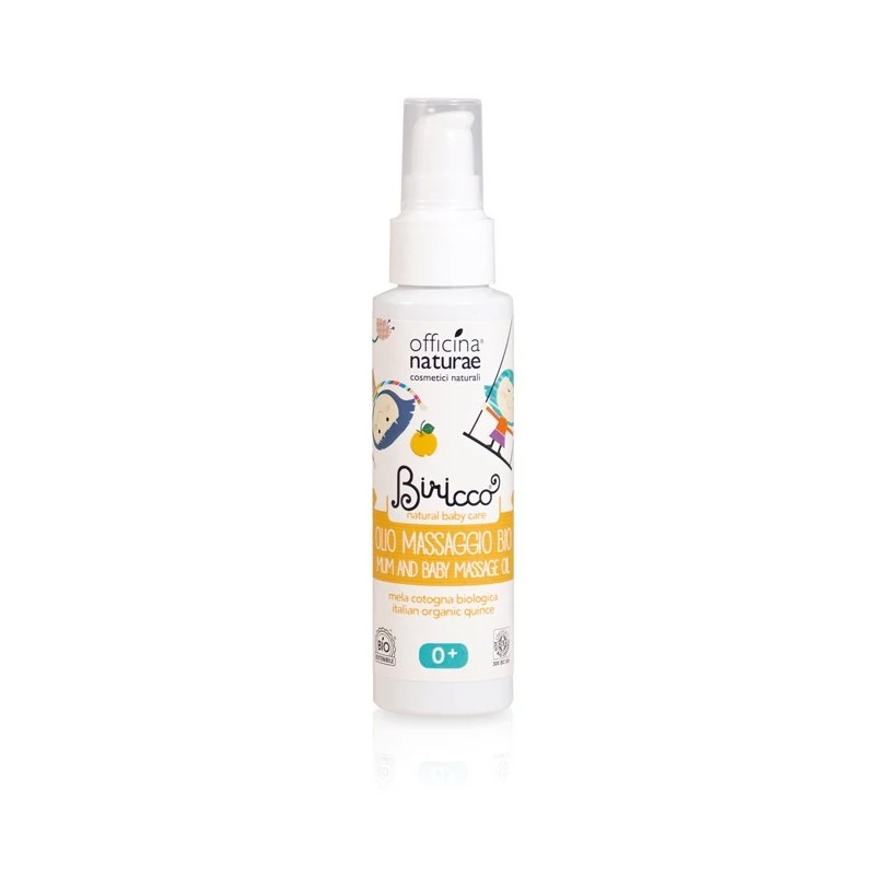 L’olio massaggio bio Biriccò è prodotto con una miscela di oli biologici, l’estratto di Mela Cotogna biologica e la Provitamina E, indicati per un tenero massaggio infantile e per tonificare ed elasticizzare la pelle della mamma durante la gravidanza.