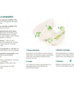 La composizione è priva di materiali cancerogeni o che possano alterare il sistema endocrino. Inoltre, sono naturalmente privi di lozioni chimiche e sono prodotti solo con cellulosa proveniente da foreste gestite in modo responsabile con certificazione FSC e TCF. Senza profumo, non sono sbiancati al cloro e sono privi di lattice: il velo a contatto con la pelle è realizzato in viscosa naturale certificata FSC mentre il velo esterno è realizzato in Bio plastica (PLA – Mater Bi) e amido di mais.