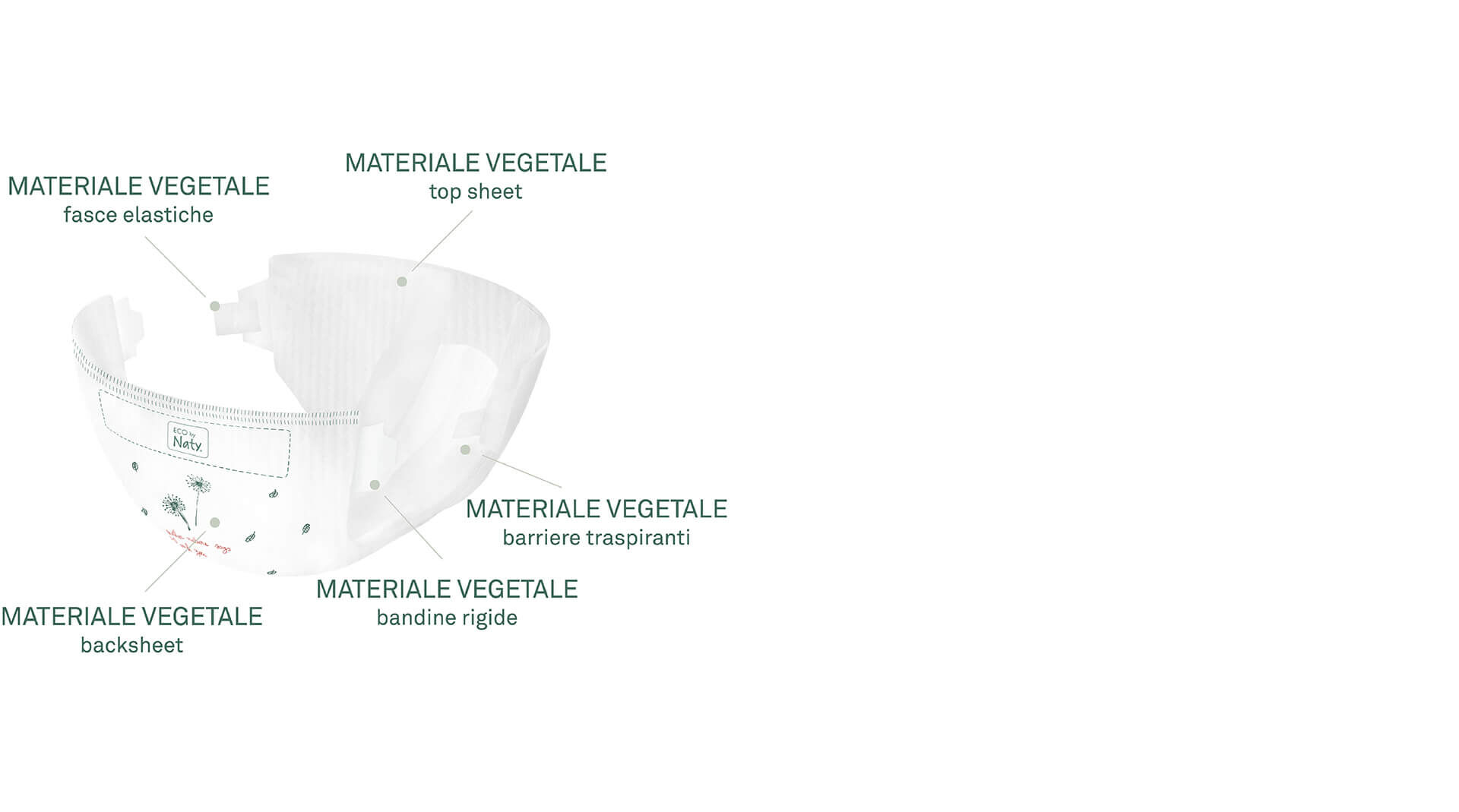 Gli strati interni sono realizzati con una pellicola a base di amido di mais senza OGM completamente biodegradabile. La pellicola garantisce un’efficace barriera contro le fuoriuscite ed è, a differenza della plastica tradizionale, naturalmente traspirante. I materiali vegetali con cui è realizzato il pannolino, provenienti dalla canna da zucchero e dal mais, rendono il pannolino traspirante e delicato sulla pelle, vista l’assenza di materiale chimico. Tutti i prodotti Eco by Naty sono OGM free al 100% con certificazione.