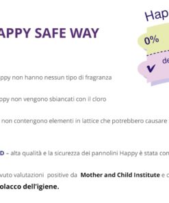 Come tutti i prodotti presenti su FreeNappy, i pants Happy utilizzano solo materie sicure e sono privi di sostanze dannose per la pelle e per l’ambiente. Grazie alla garanzia del sistema Happy Safe Way, per la produzione vengono utilizzate solo materie prime sicure senza utilizzare cloro, lattice o profumo.